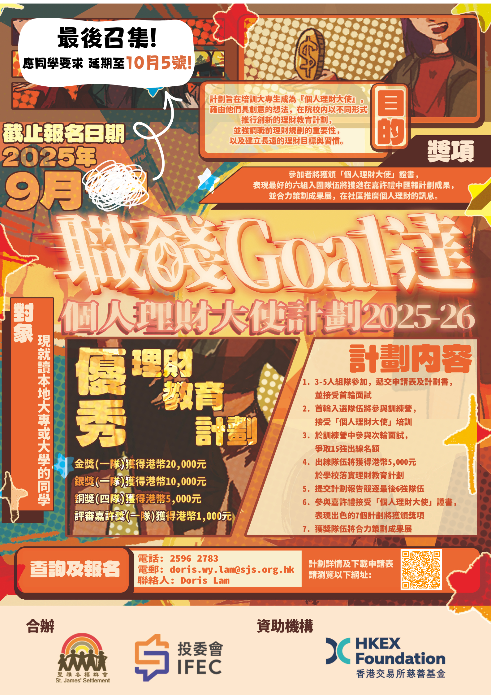 個人理財大使計劃 2025-2026 由香港交易所慈善基金資助,並由投委會及聖雅各福群會合辦。